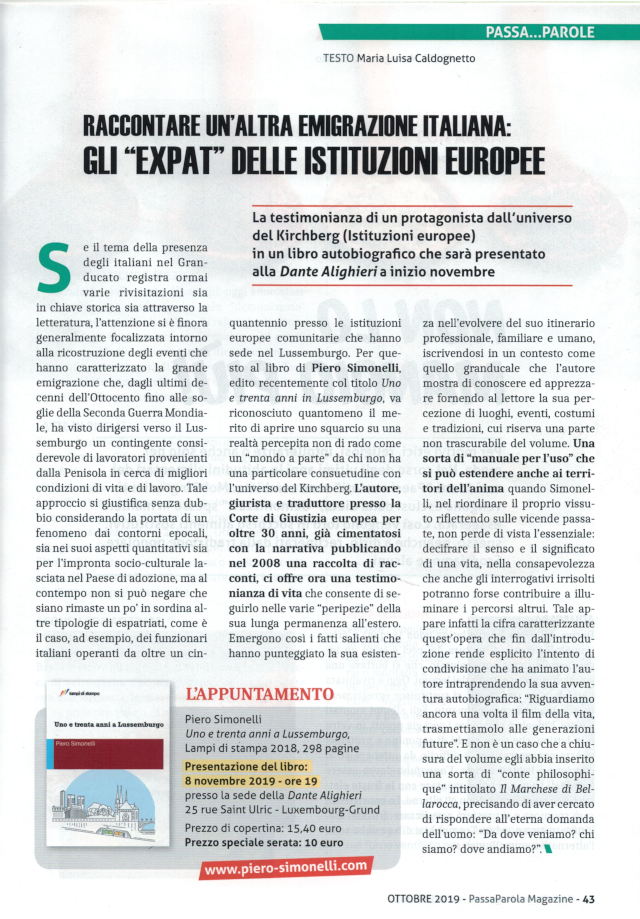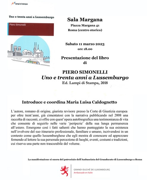 Piero Simonelli has worked for more than 30 years at the translation services of the Court of Justice of the European Union. He has published two books, of a literary nature: " Racconti da Lussemburgo", Lampi di stampa, Milan, 2008, and, recently, " Uno e trenta anni a Lussemburgo". In this last book the author tells how, coming from Italy, he lived and integrated himself in the Grand Duchy, a country of which he talks about traditions and customs, also thanks to his travels. The books are available at the " Libreria italiana ", in Luxembourg, or on the website: www.lampidistampa.it . The books are available also from Amazon, Feltrinelli and IBS Messagerie.